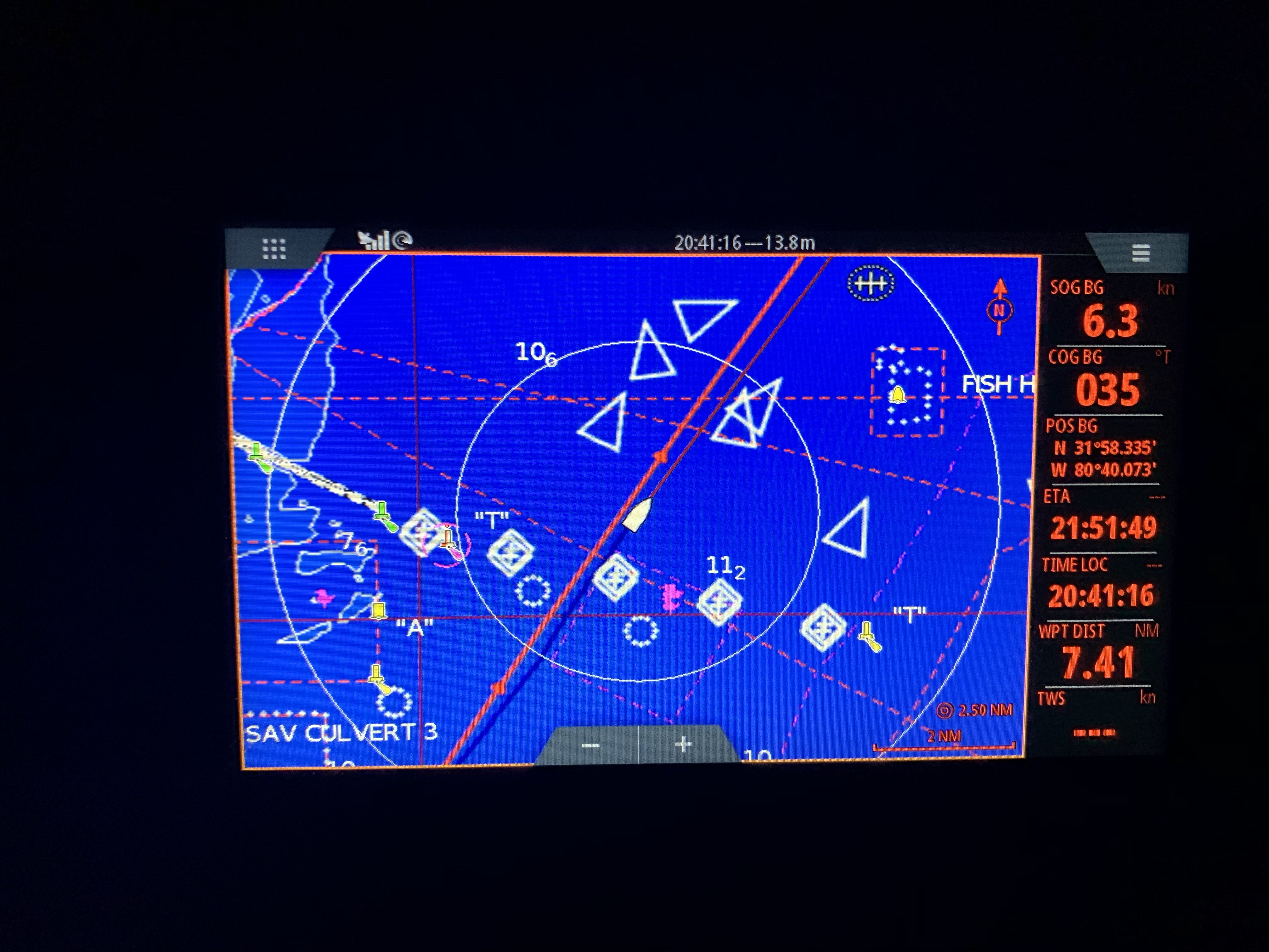 Ein paar Tage später ging es Einhand um 04:00 Uhr Nachts bei Regen und Gewitter mit etwas mulmigen Gefühl los. Die erste Etappe verlief gut 200 SM auf dem Atlantik um Cape Canaveral bis nach St. Augustine, wo ich am übernächsten Tag angekommen bin. Nachts habe ich in diesen Wochen mein System mit kurzen 10 minütigen Schlafintervallen gefunden. Der Radar läuft immer mit eingestellten GUARD ( einer Warnung bei Annäherung) im voraus Modus und schlägt Alarm bei einer Entfernung zwischen 0,5 nm und 1 nm.