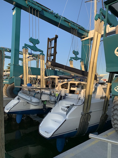 Der große Augenblick kann kommen und er rollt an, der Mega Travelift. Ellen bessert nach dem Anheben noch das Antifouling unterm Kiel aus und ab gehts zurück ins Wasser. Was für ein Augenblick. Die Maschinen springen beide an, die Propeller werden auf voraus und zurück gecheckt und dann geht es raus aus der Box in den ICW (Intracostal Waterway). Es ist schon spät und die Sonne geht unter. Nur 5 NM entfernt liegt eine schöne Ankerbucht in Beaufort NC.