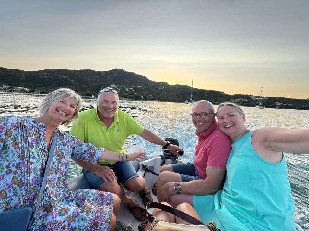 und genießen den sardischen Sommer. Gabi, Alex und Klaus, unsere Ski-Freunde aus Gargellen, kommen uns besuchen. Mal sehen ob den Alpensurfern und Brettlfetzern auch Seebeine wachsen….(-: